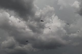 Clouds heap into the horizon, their bellies bruised with thunder.